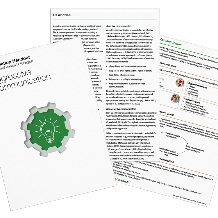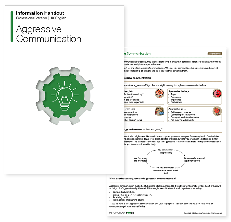 Assertive communication can have a positive impact on people’s mental health, relationships, and work life. A key component of assertiveness training is recognizing different ‘styles’ of communication. This Aggressive Communication information handout provides a detailed overview of this communication style. It describes common signs of aggressive communication, factors that perpetuate it, and the negative consequences it can have for individuals and their relationships.