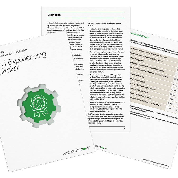 A symptom checklist to help clients reflect on symptoms of bulimia and explore whether a professional assessment may be beneficial.