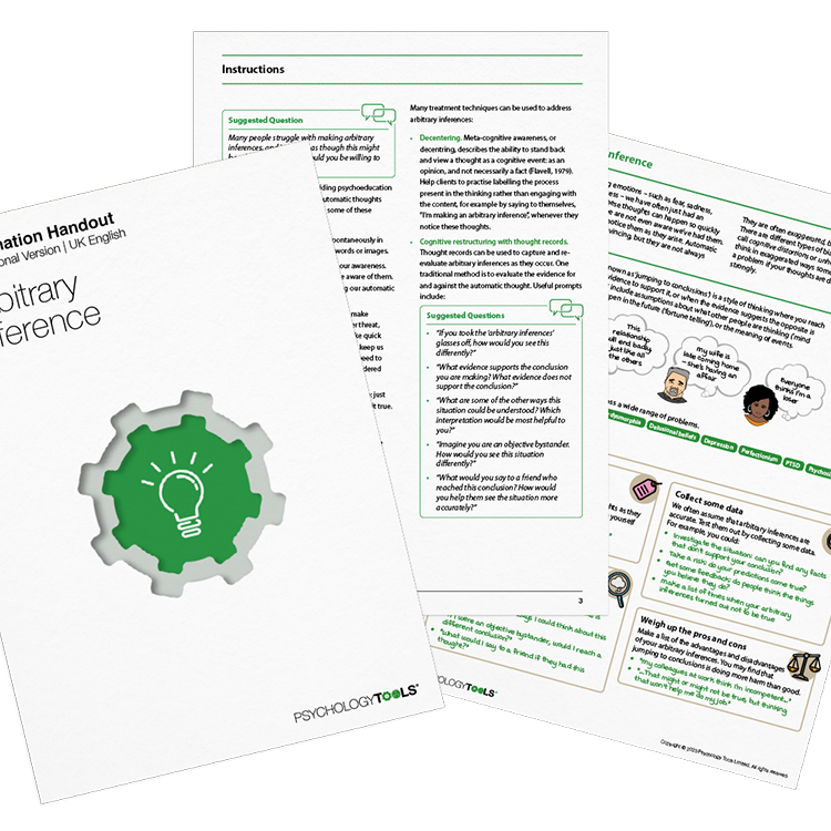 Arbitrary inference is one of the earliest and broadest cognitive disotortions described in cognitive behavioral therapy (CBT). Aaron T. Beck defines it as "the process of forming an interpretation of a situation, event, or experience when there is no factual evidence to support the conclusion or when the conclusion is contrary to the evidence". The Arbitrary Inference information handout forms part of the cognitive distortions series, designed to help clients and therapists to work more effectively with common thinking biases.