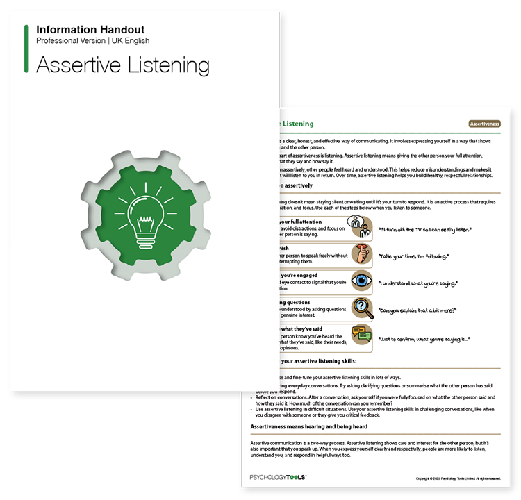 Designed for use in therapy sessions, the Assertive Listening resource combines psychoeducation and practical guidance to build awareness and develop core communication competencies. Assertive listening supports clearer dialogue, improved relationships, and mutual understanding.