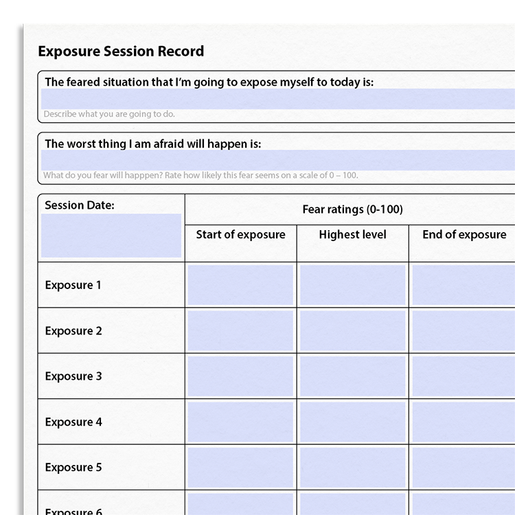 The Exposure Session Record is a tool for recording clients’ use of exposure. The worksheet guides clients to identify a specific fear they are willing to confront, track their responses during exposure, encourage them to repeat exposures within a session, and to consolidate their learning afterwards. The worksheet is agnostic regarding whether the therapist takes an emotional processing (habituation) or inhibitory learning approach to exposure and is equally suited to capturing the relevant information succinctly.