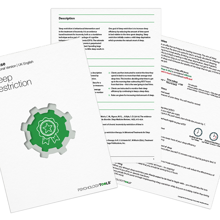 Sleep restriction is an effective behavioral intervention used to treat insomnia by improving sleep quality and efficiency. By initially inducing a mild sleep deficit, this technique encourages natural sleep onset and consolidates sleep periods, thus reducing excessive time in bed without sleep. It is a core component of cognitive behavioral therapy for insomnia (CBT-I) and can be used independently or within a treatment package.