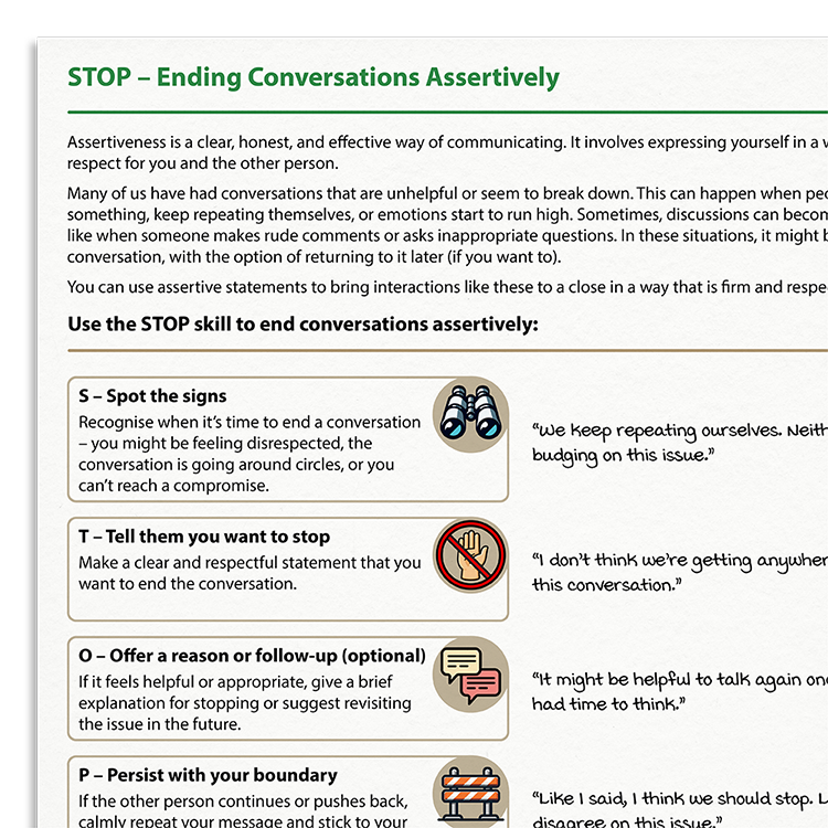 STOP – Ending Conversations Assertively is a practical information handout that teaches clients how to disengage from unhelpful conversations in a calm, firm, and respectful way.