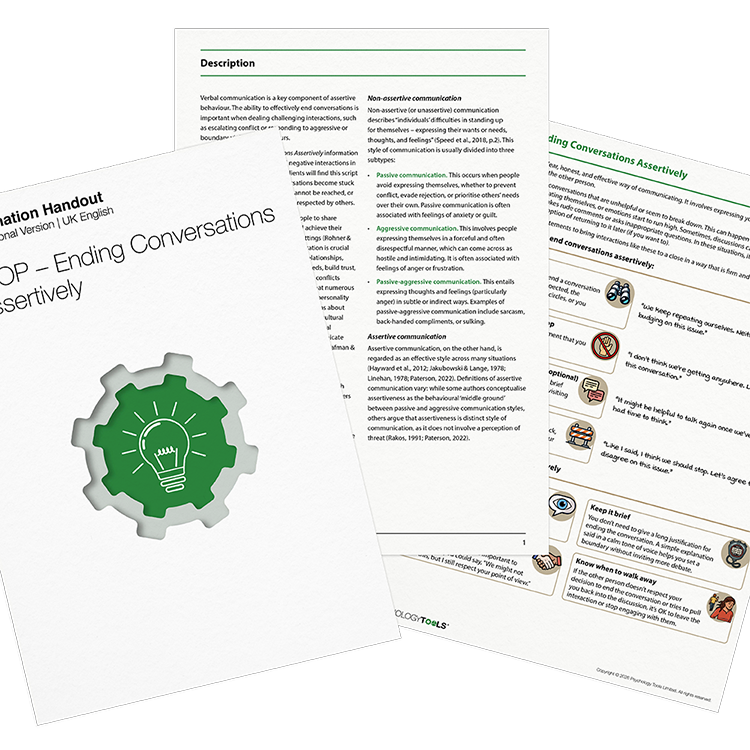 Verbal communication is a key component of assertive behaviour. The ability to effectively end conversations is important when dealing challenging interactions, such as escalating conflict or responding to aggressive or boundary-violating behaviours.