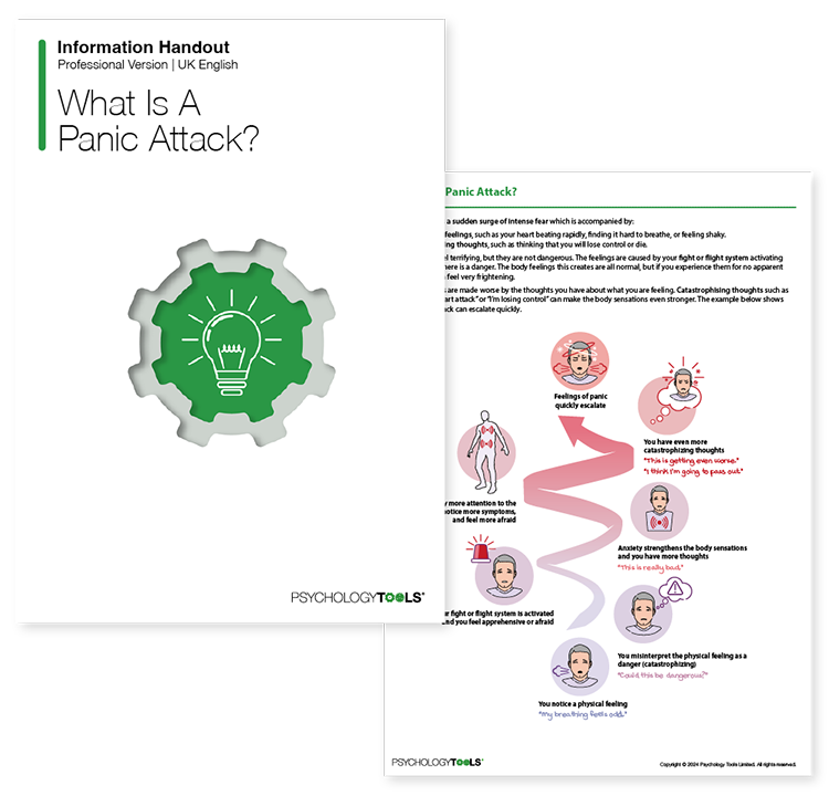 Panic attacks are single episodes of intense fear or discomfort that begin suddenly and reach a peak within minutes. The cognitive behavioral model of panic suggests that misinterpreting benign body symptoms as a threat leads to activation of the fight-or-flight system, which can in turn exacerbate the intensity of panic symptoms. This educational handout demonstrates a typical escalation sequence for panic attacks.