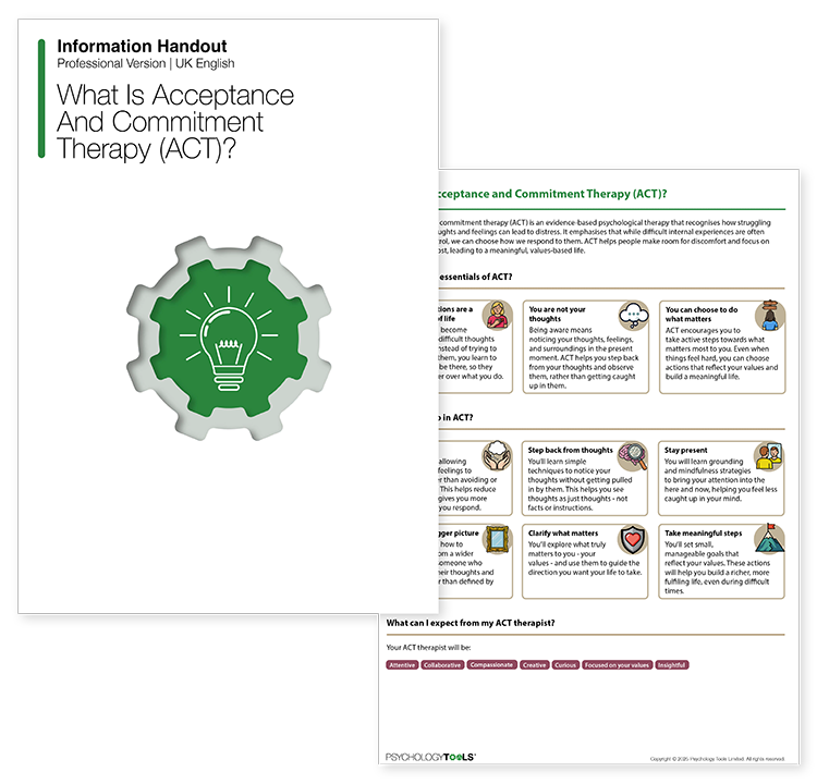 Acceptance and commitment therapy (ACT) is an evidence-based psychological intervention that helps people build a more flexible and values-guided life, even in the presence of difficult thoughts, feelings, and experiences. Central to ACT is the understanding that psychological distress often arises not from the content of our thoughts or emotions, but from how we relate to them and the efforts we make to avoid or control them. ACT helps people develop greater psychological flexibility by fostering acceptance, present-moment awareness, and committed action. This What Is Acceptance And Commitment Therapy (ACT)? information handout introduces clients to ACT, offering an overview of its core processes and therapeutic focus.