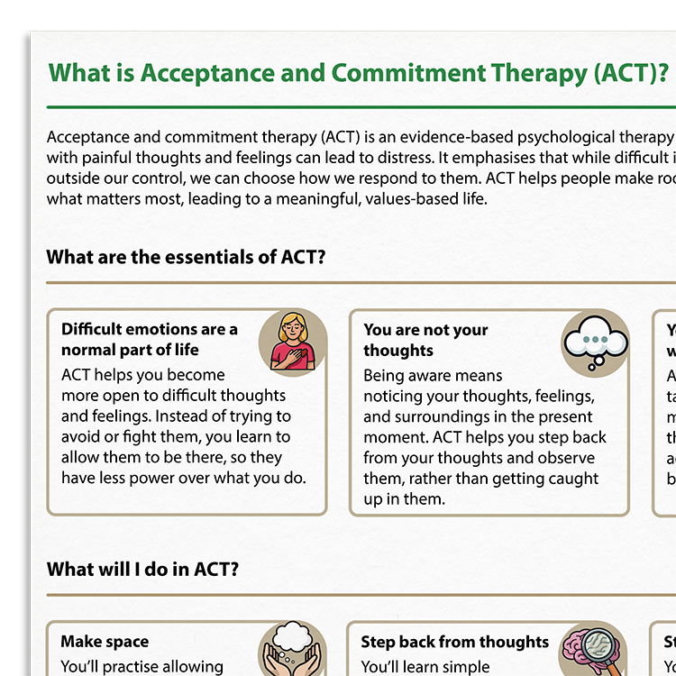 This accessible information handout describes the key principles of acceptance and commitment therapy (ACT).