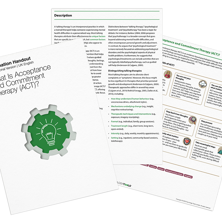 ACT has been evaluated in clinical research and has demonstrated beneficial outcomes across multiple studies (A-Tjak et al., 2015). Clinical guidelines such as those developed by the National Institute for Health and Care Excellence (NICE) recommend that ACT is considered for people 16 years and over experiencing chronic primary pain (NICE, 2021). In addition, the American Psychological Association (APA) classify ACT as having ‘modest’ research support for the treatment of obsessive compulsive disorder (OCD) and depression (pending re-evaluation), for example (American Psychological Association, Division 12, 2022). Therapists are encouraged to review best practice guidelines if they are considering offering ACT for the treatment of a specific disorder or condition.