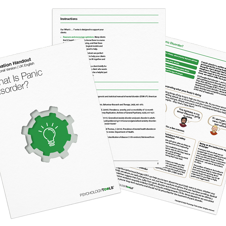 The What Is Panic? information handout is designed to help clients with panic attacks and panic disorder understand more about their condition. It includes a summary of the most common symptoms of panic attacks and panic disorder, and insights into why panic disorder might not get better by itself, derived from the Clark (1986) cognitive model of panic.